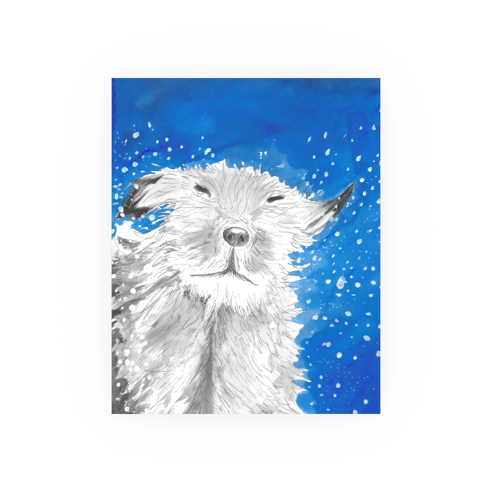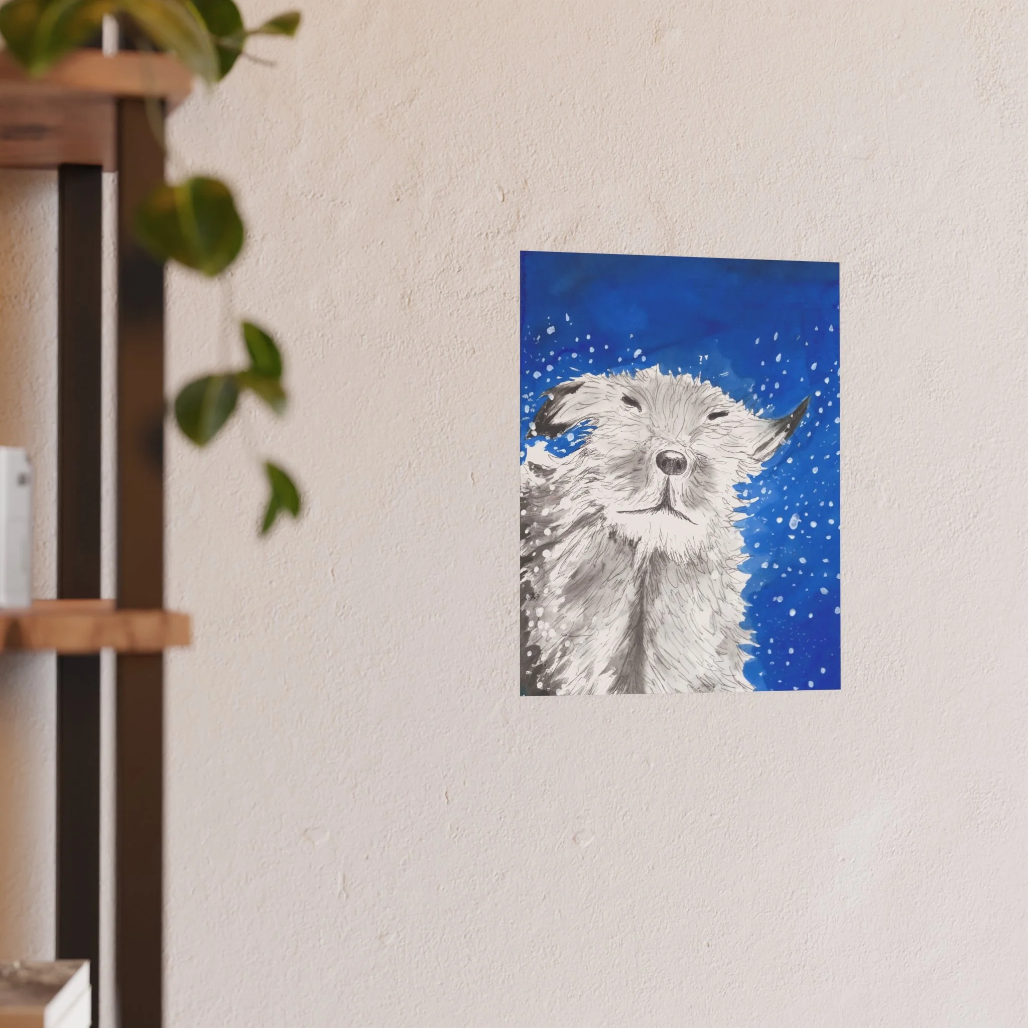 A dog drying off after a bath, water droplets flying everywhere. Choose satin for a gentle sheen that enhances the blues, or archival matte for a museum-quality, glare-free finish that keeps the texture of the brushstrokes alive. Printed with vivid color reproduction on sturdy paper and assembled in the USA, this poster slips easily into small gallery walls, cozy nooks, or above a reading chair to bring warmth and motion to the room.