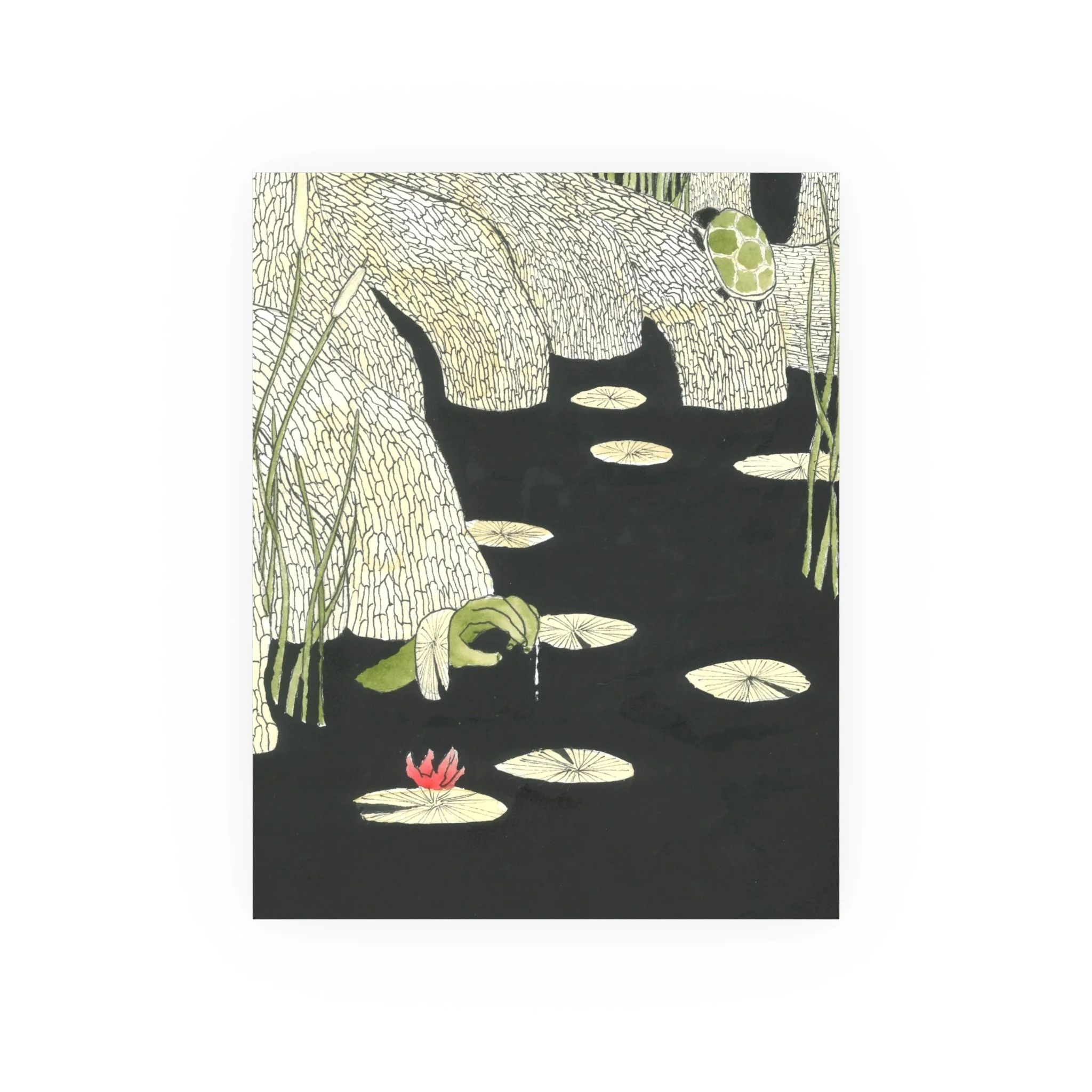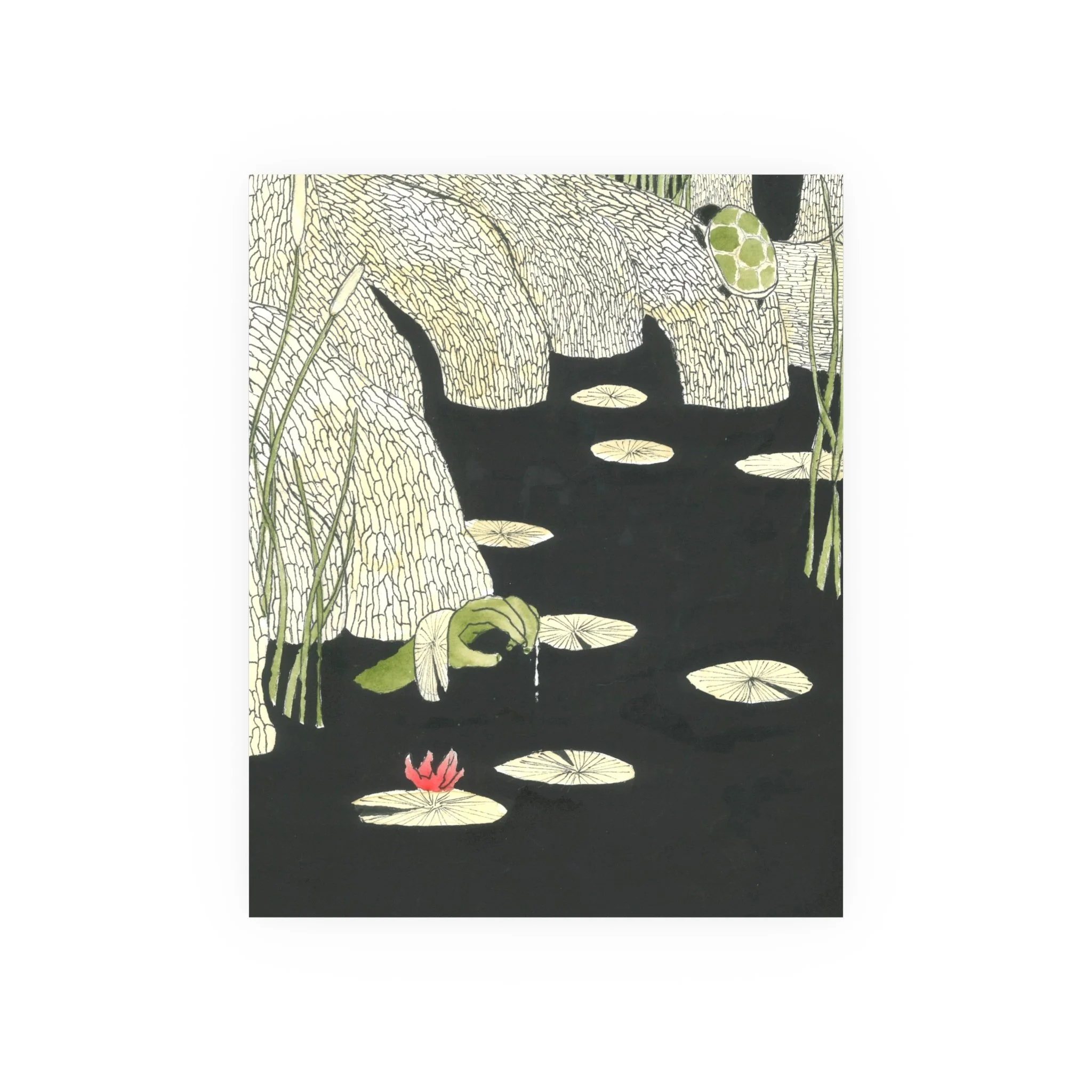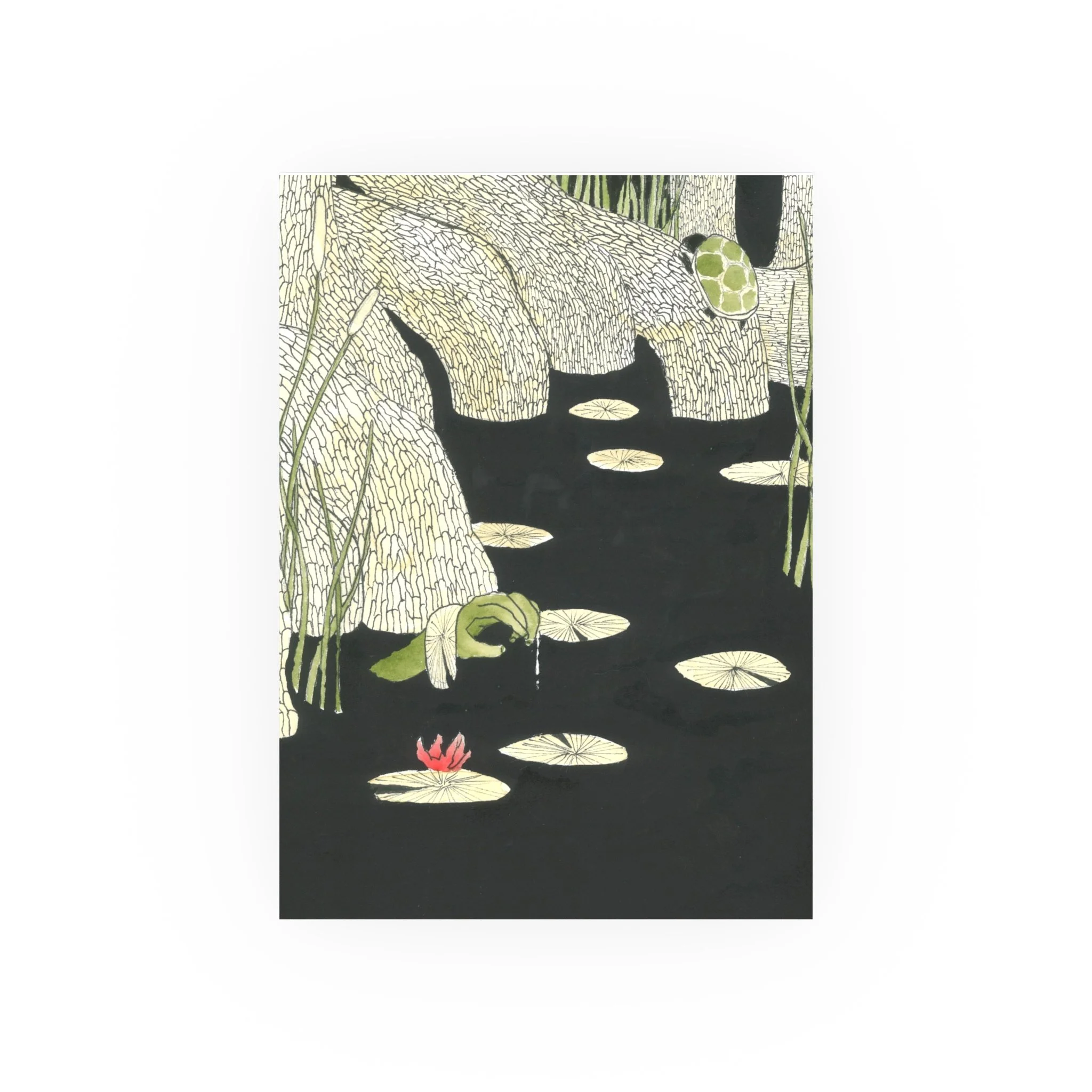 A strange arm reaches up from a pond of black water, perhaps a creepy zombie brought back to life. It happens.